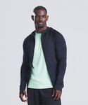 Sports zoodie with adjustable drawcords hood, raglan sleeves with thumb holes and full-front zip. Contrast fabric on sleeves and body.